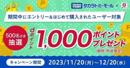 【11/20~12/20】(dポイント)タカラトミーモール 抽選で500名にdポイント1000ptプレゼント!