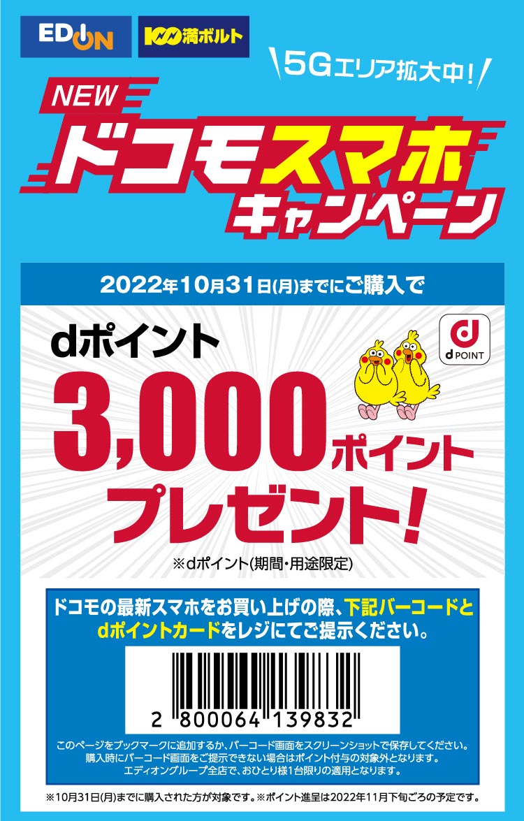 ①ドコモの対象スマホを購入時にキャンペーンサイトのバーコードとdポイントカードをレジで提示するとdポイント3000ptプレゼント。